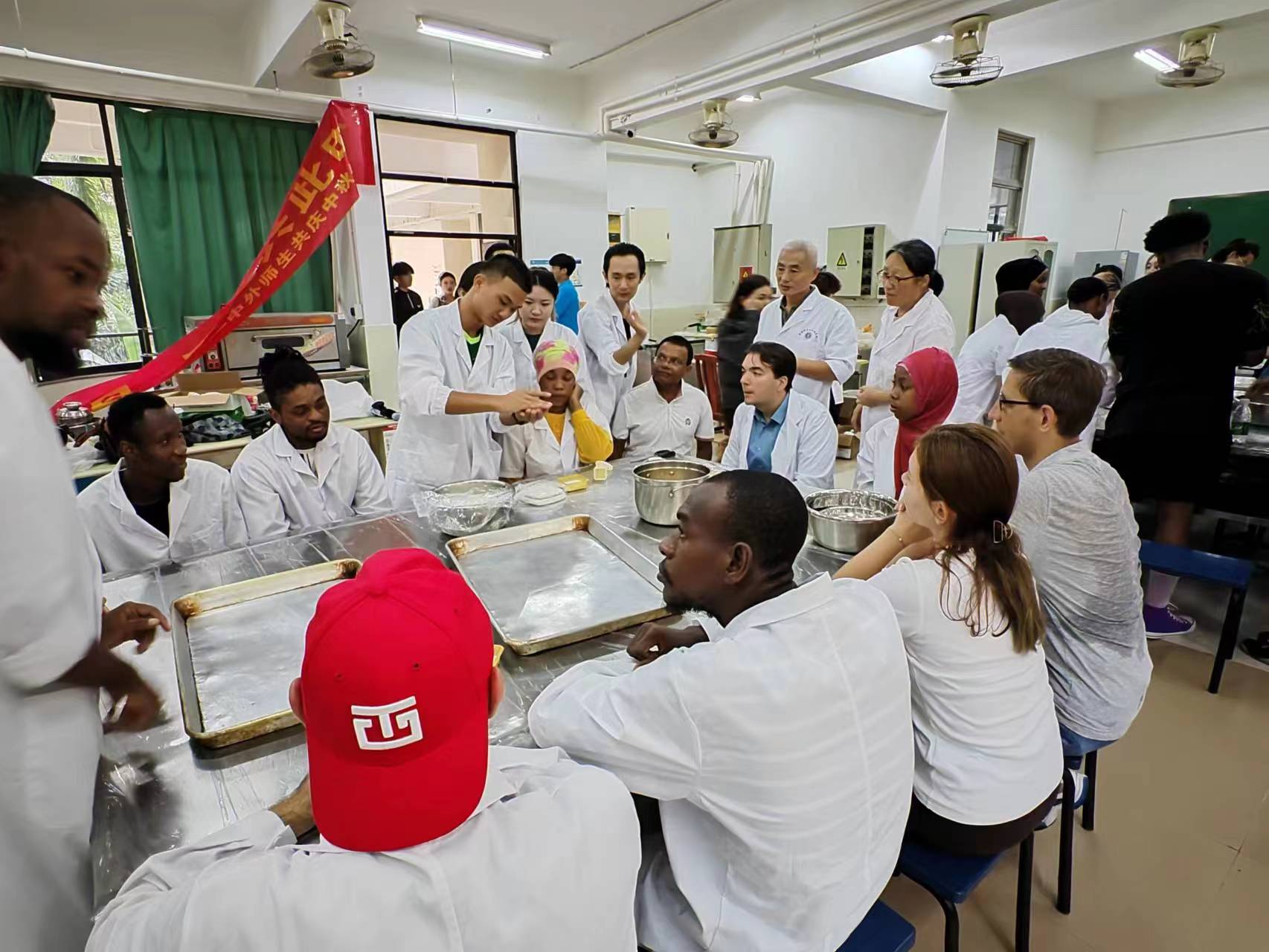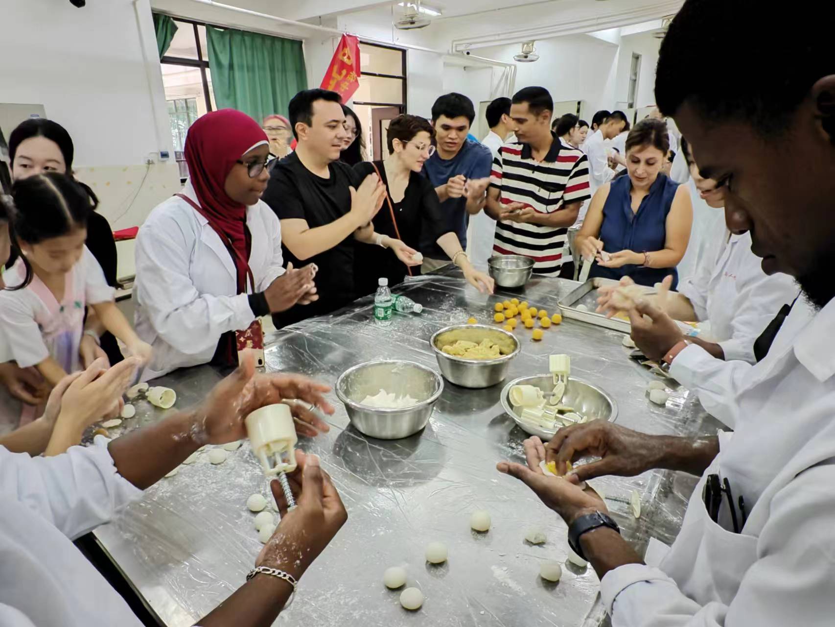 活动中,老师们详细讲解了月饼的制作工艺,从面皮的搅拌、馅料的制作到月饼的成型,让中外师生们对月饼制作有了更加深入的了解。在实际操作环节,中外师生分成小组,亲自动手制作月饼,共享其乐,共度中秋。