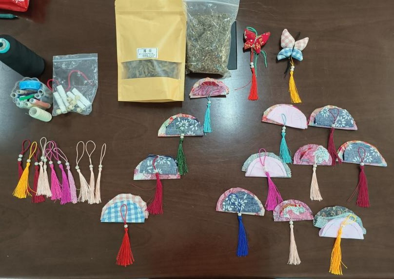 活动现场,艾叶、藿香、薄荷等中药材的清香与节日氛围交织,营造出温馨而热烈的氛围。桌上整齐摆放着色彩斑斓的香囊布料、丝线以及多种具有驱虫避秽功效的中药材。活动伊始,胡亚芹教授为大家讲述了端午节佩戴香囊的历史渊源与文化寓意,从民俗传统视角出发,解读古人在端午时节通过香囊祈福安康、驱邪避灾的美好愿景,让大家深刻感受到传统文化中蕴含的智慧与情怀。