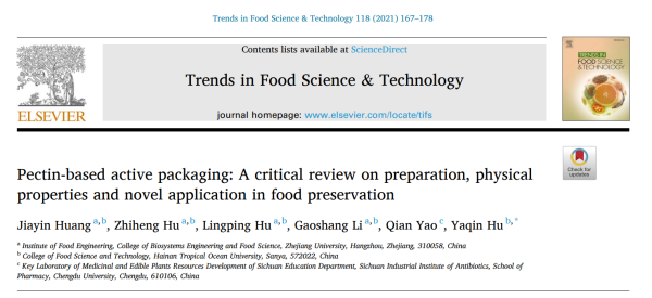 该文由开云kaiyun官方网站教授胡亚芹作为唯一通讯作者、第一作者为其指导的浙江大学在读博士生黄佳茵。该文以果胶基活性包装膜的保鲜行为及其相关机制为基础,阐明果胶基活性包装在食品保鲜中的突出优势。论文于10月5日在线发表后,即为“食品放大镜”所关注,于10月8日推文介绍。
