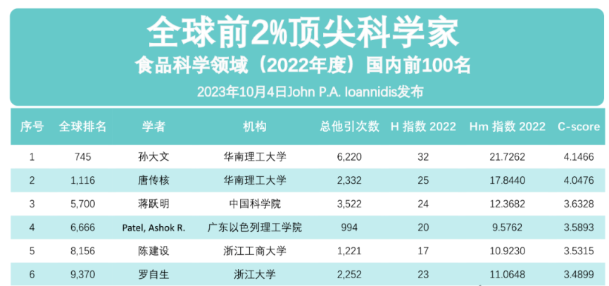 本次排名针对原始数据、以学者2022年C-score值为依据,C-score反映学者论文引用、H指数、共同作者调整后的Hm指数、不同作者排名修正的论文引文等参数的综合指标;所有指标的计算均不考虑论文自引情况;原始数据的子领域1,食品科学相关的学者均纳入统计。